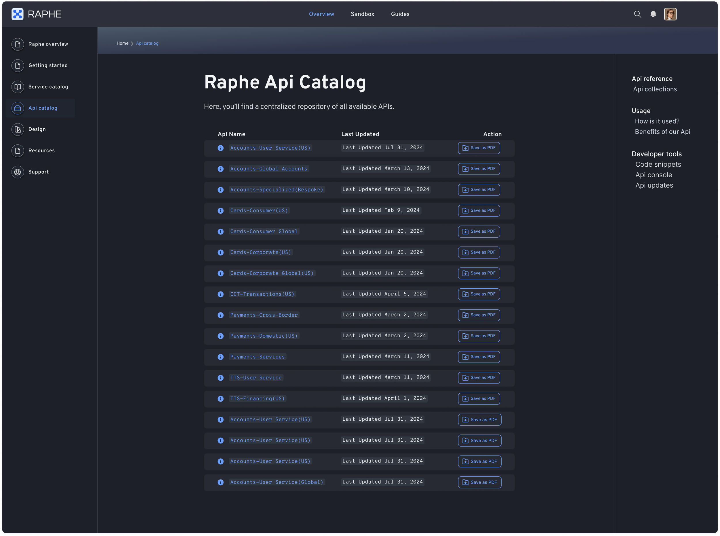 Raphe is the developer portal for Global Bank, designed to establish a single source of truth for design and reduce developer friction across the entire lifecycle of the bank's product ecosystem.